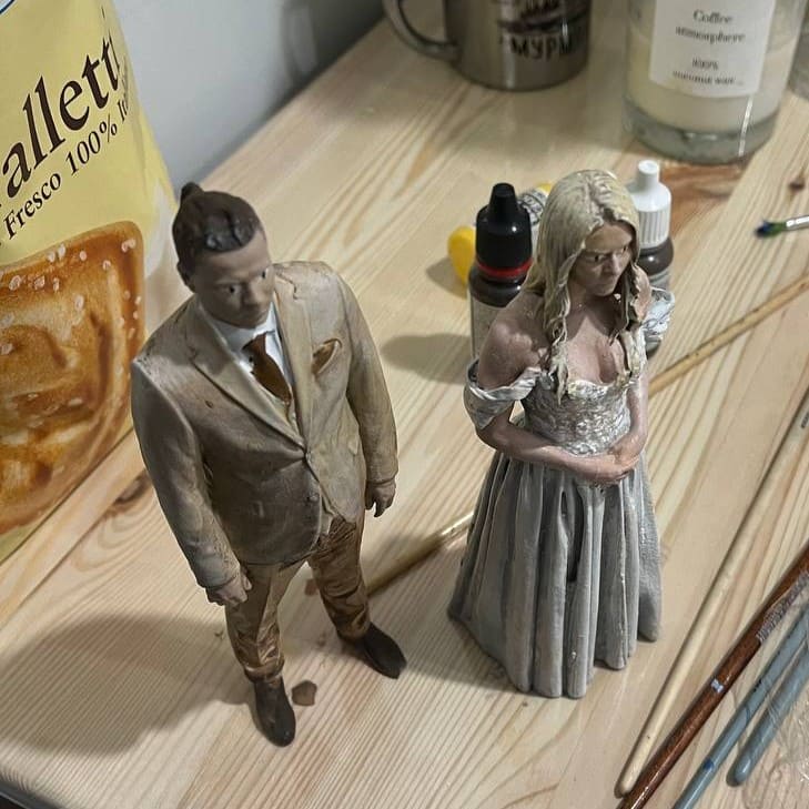 После завершения печати изделия прошли стандартную постобработку. Мы выполнили промывку моделей в изопропиловом спирте, провели финальное УФ-отверждение и удалили поддерживающие элементы. В некоторых зонах была сделана лёгкая шлифовка, чтобы подготовить поверхность под финальную отделку. Заключительным этапом стала художественная роспись. Художник вручную прорисовал каждую деталь — черты лица, цвет волос, текстуру тканей и оттенки кожи. Особое внимание уделялось свадебному платью и костюму, чтобы фигурки максимально соответствовали оригинальным образам.