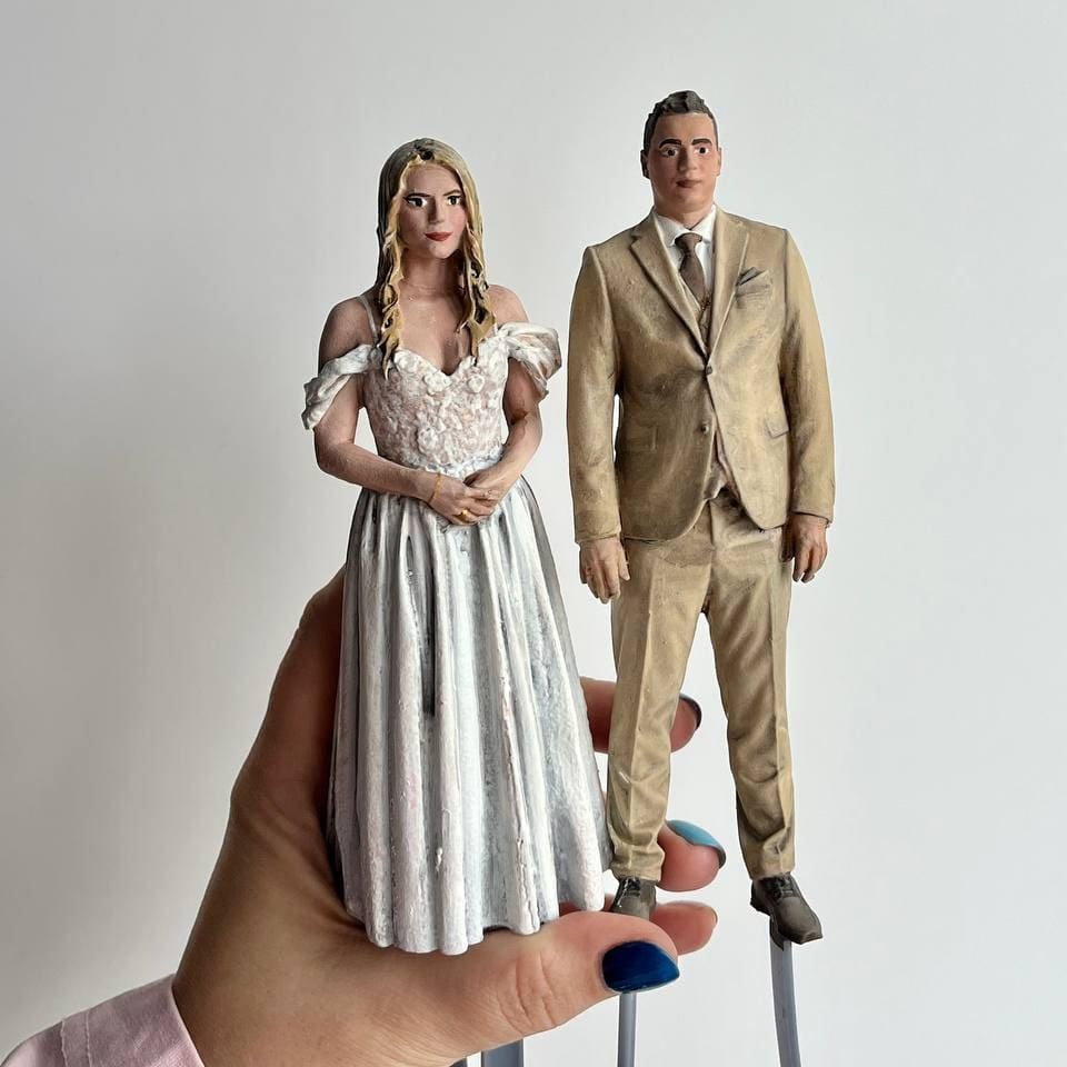 Молодожёны обратились к нам с просьбой изготовить фигурки для свадебного торта, которые стали бы их точными копиями. Главной целью было создать индивидуальный аксессуар, полностью отражающий внешний вид жениха и невесты в день свадьбы. В отличие от стандартных пластиковых фигурок, решение должно было быть максимально персонализированным, детализированным и реалистичным.