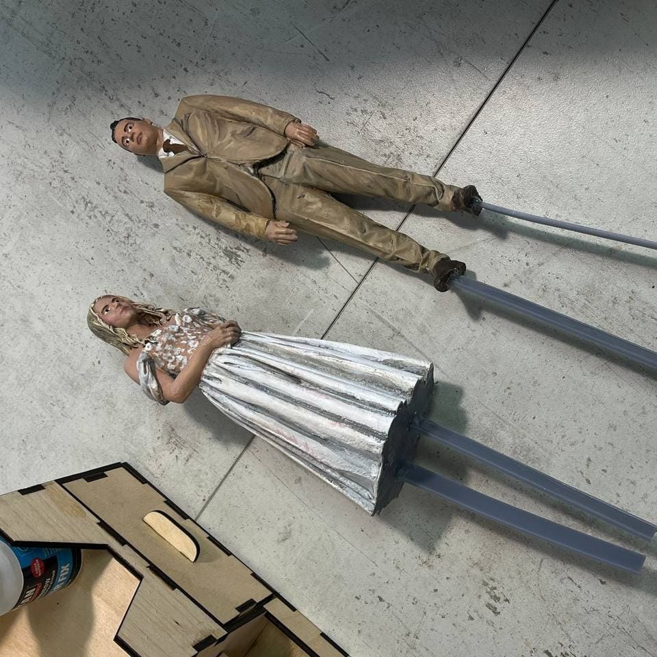 Проект был выполнен с использованием фотополимерного 3D-принтера Elegoo Saturn 4 Ultra. В качестве исходных данных использовалось 3D-сканирование жениха и невесты с последующей цифровой обработкой модели. Для печати применялась серая инженерная смола с высотой слоя 0.05 мм. Среднее время производства одной фигурки составило всего 4–5 часов. После печати изделия были промыты в изопропиловом спирте, прошли УФ-досветку, зачистку и подготовку под покраску. Финальным этапом стала ручная художественная роспись акриловыми красками, которая придала миниатюрам завершённый и реалистичный вид.
