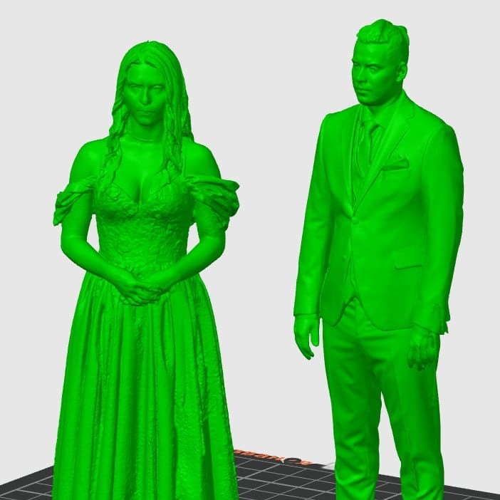 Работа началась с 3D-сканирования жениха и невесты. Современное оборудование позволило зафиксировать мельчайшие детали: черты лица, элементы прически, складки на платье и линии костюма. Полученные цифровые копии были обработаны нашими специалистами. Мы устранили дефекты геометрии, подчистили артефакты и усилили детализацию, сохранив при этом естественность и характер каждой фигуры. На заключительном этапе модели адаптировали для печати в SLA-технологии, чтобы обеспечить высокий уровень качества при производстве.